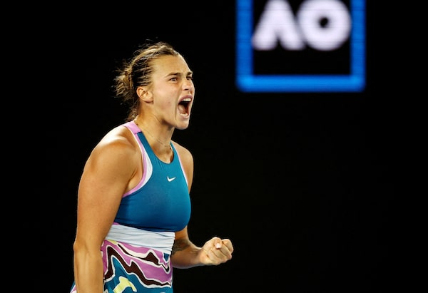 Aryna Sabalenka reacts during her Australian Open match against Magda Linette, in Melbourne, on Jan. 26.CARL RECINE/Reuters