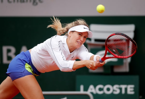 Eugenie Bouchard hits a return to Iga Swiatek during their third-round match at the French Open in Paris on Oct. 2, 2020.CHARLES PLATIAU/Reuters