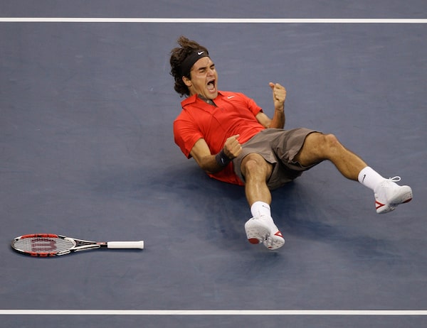 Federer celebrates after defeating Andy Murray in three sets to win the men's finals championship match at the U.S. Open in New York on Monday, Sept. 8, 2008.Julie Jacobson/The Associated Press