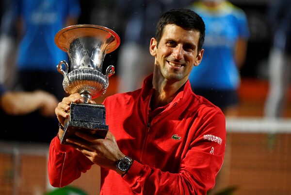 Serbia's Novak Djokovic celebrates with the trophy after winning the Italian Open in Rome on Sept. 21, 2020.RICCARDO ANTIMIANI/Reuters