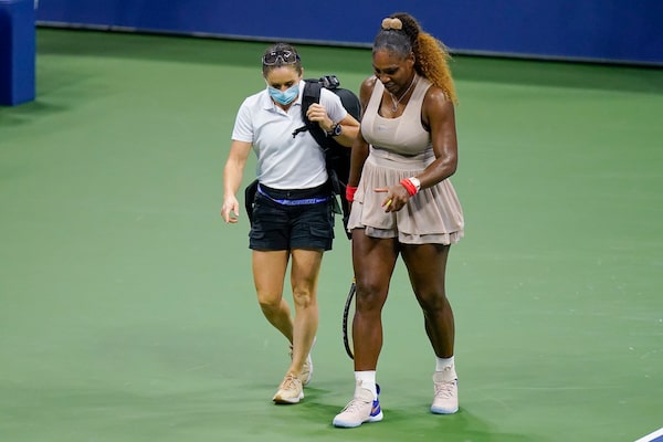 Serena Williams walks to her bench with a trainer for a medical timeout during the semi-final match she lost at the 2020 U.S. Open against Victoria Azarenka on Sept. 10.Seth Wenig/The Associated Press