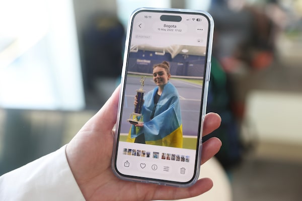 Anzhelika Kotliantseva shows an old photo of her daughter, Mariia Vainshtein, wearing the flag of Ukraine after she won a tennis tournament at the Cary Leeds Center for Tennis and Learning in the Bronx borough of New York.Heather Khalifa/The Associated Press