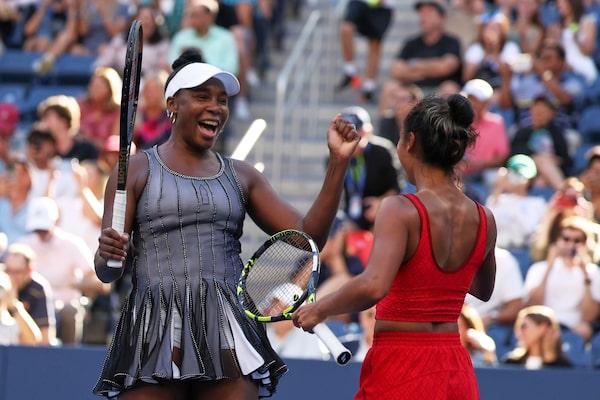 Venus Williams and Leylah Fernandez celebrate after winning their doubles match on Saturday.Heather Khalifa/The Associated Press