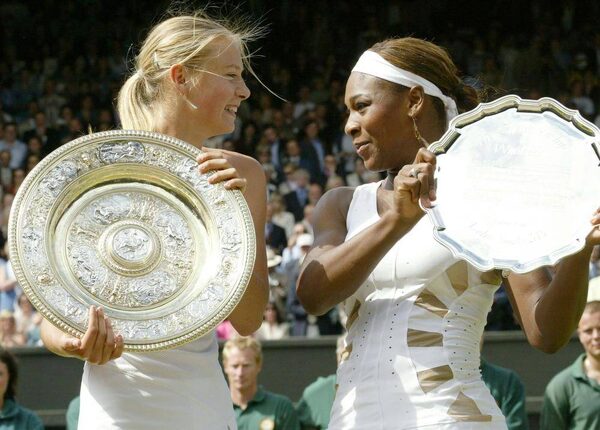 Sharapova holds the winner's trophy alongside Serena Williams after winning Wimbledon in 2004.The Associated Press