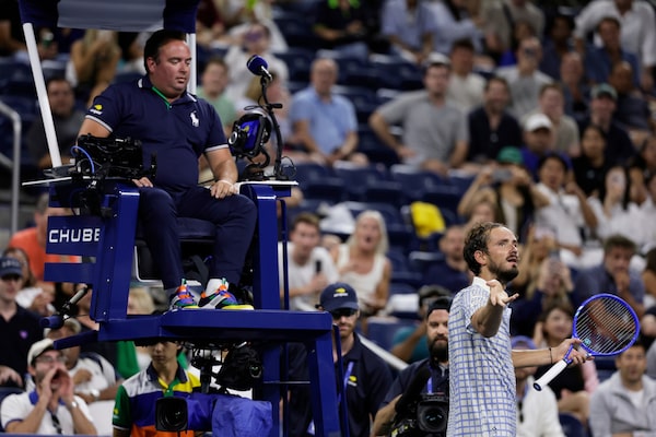 Daniil Medvedev, of Russia, bottom right, reacts next to chair umpire, Greg Allensworth, left, after a photographer ran onto the court during a match against Benjamin Bonzi, of France, in the first-round of the U.S. Open tennis championships, Sunday night in New York.Adam Hunger/The Associated Press
