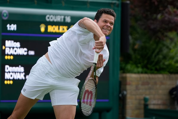 Raonic serves to Austria's Dennis Novak at Wimbledon in July, 2023. It marked the final year that the Canadian talent would compete there.Alastair Grant/The Associated Press