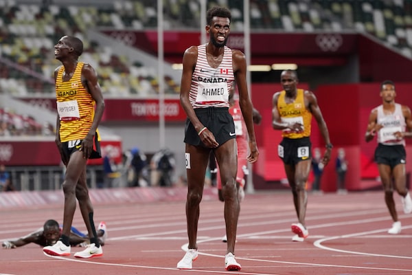 Moh Ahmed, centre, after winning the silver medal in the men's 5,000-metre during the Tokyo Olympics in 2021. The long-distance runner is one of more than 400 Canadians who signed a letter calling for Canada’s Davis Cup tie with Israel to be cancelled.Nathan Denette/The Canadian Press