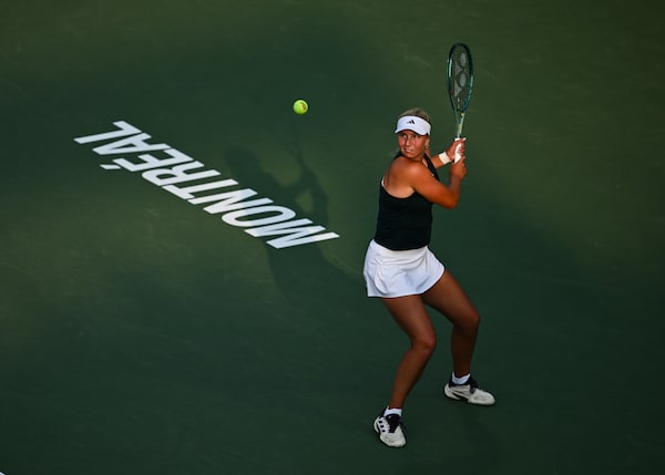 Clara Tauson of Denmark plays a backhand against Madison Keys of the United States during their quarter-finals singles women's match at the National Bank Open at IGA Stadium on Tuesday in Montreal.Minas Panagiotakis/Getty Images