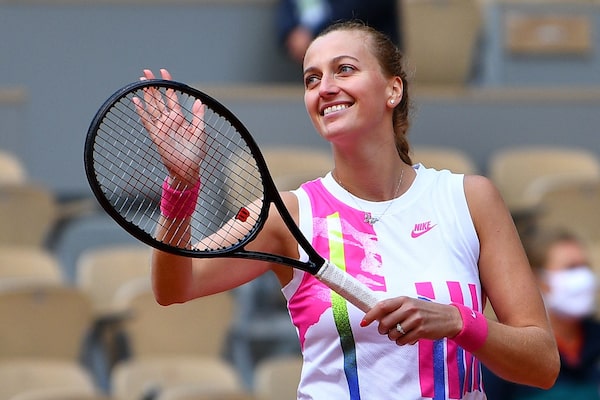 Petra Kvitova celebrates after defeating Laura Siegemund at the French Open in Paris on Oct. 7, 2020.ANNE-CHRISTINE POUJOULAT/AFP/Getty Images