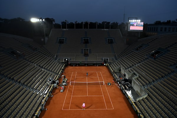 A general view of Court Suzanne Lenglen as Ons Jabeur and Danielle Collins warm up ahead of a match on day nine of the 2020 French Open on Oct. 5, 2020 in Paris.Shaun Botterill/Getty Images