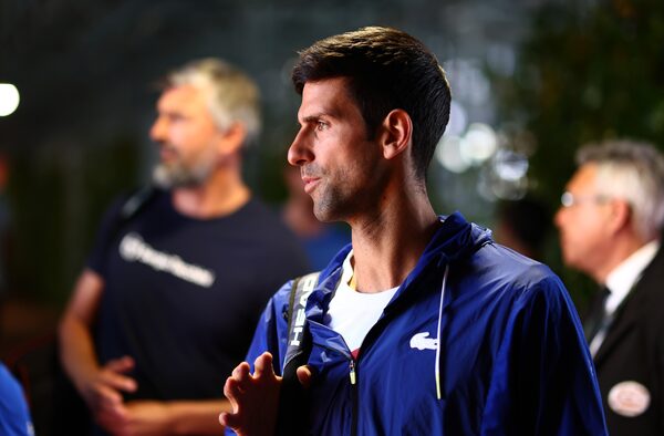 Novak Djokovic of Serbia waits with his coach Goran Ivanisevic before going on court for a practice session on day four of the Mutua Madrid Open at La Caja Magica in Spain on May 1.Clive Brunskill/Getty Images
