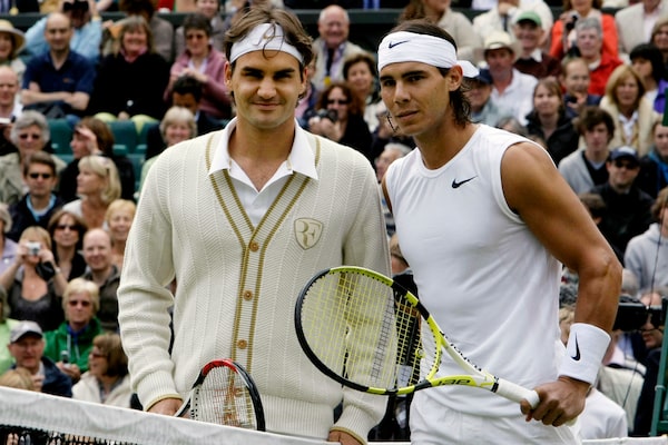 Roger Federer left, and Rafael Nadal pose for a photo prior to the start of the men's singles final at Wimbledon, in London, on July 6, 2008.Anja Niedringhaus/The Associated Press