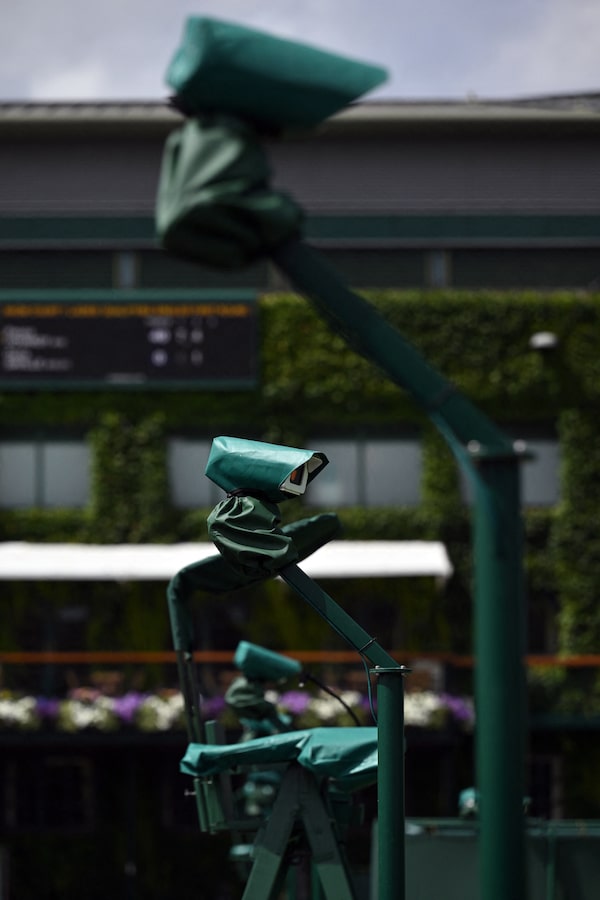 Hawkeye cameras at the All England Lawn Tennis & Croquet Club in Wimbledon on June 24, 2025. For the first time in the tournament's 148-year history, the men and women stationed at the back of the court, calling "out" and "fault", will be missing.GLYN KIRK/AFP/Getty Images