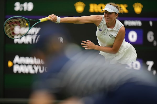 Russia's Anastasia Pavlyuchenkova serves to Sonay Kartal of Britain during a fourth round women's singles match at the Wimbledon Tennis Championships in London, July 6, 2025.Alastair Grant/The Associated Press
