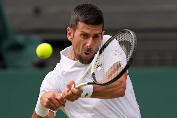 Novak Djokovic hits a return during a Wimbledon match against Hubert Hurkacz, in London, on July 10.Alberto Pezzali/The Associated Press
