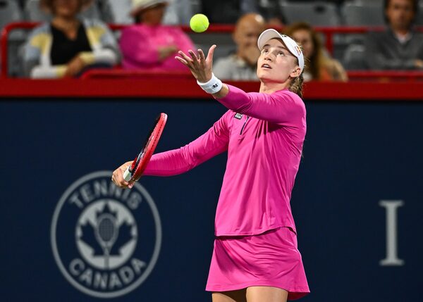 MONTREAL, CANADA - AUGUST 11: Elena Rybakina of Kazakhstan serves against Daria Kasatkina on Day 5 during the National Bank Open at Stade IGA on August 11, 2023 in Montreal.Minas Panagiotakis/Getty Images