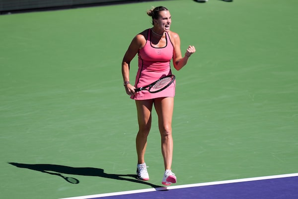 Aryna Sabalenka, of Belarus, reacts after winning a point against Canada's Victoria Mboko during a quarter-final match at the BNP Paribas Open tennis tournament on Thursday in Indian Wells, Calif.Mark J. Terrill/The Associated Press