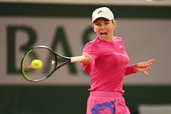 Simona Halep hits a return during her first round French Open match against Sara Sorribes Tormo, at Roland Garros, in Paris, on Sept. 27, 2020.Shaun Botterill/Getty Images