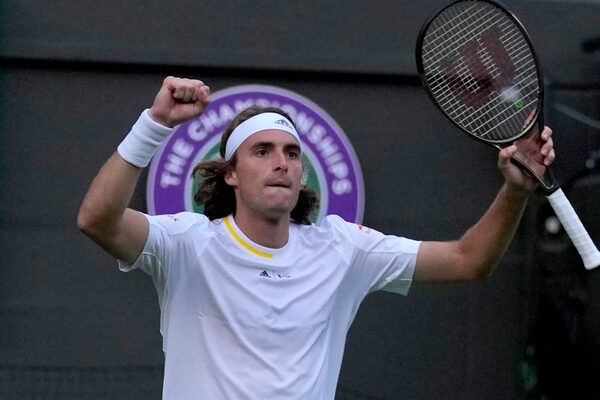 Greece's Stefanos Tsitsipas celebrates after defeating Switzerland's Alexander Ritschard in a singles tennis match on day two of the Wimbledon tennis championships in London on June 28, 2022.Alastair Grant/The Associated Press