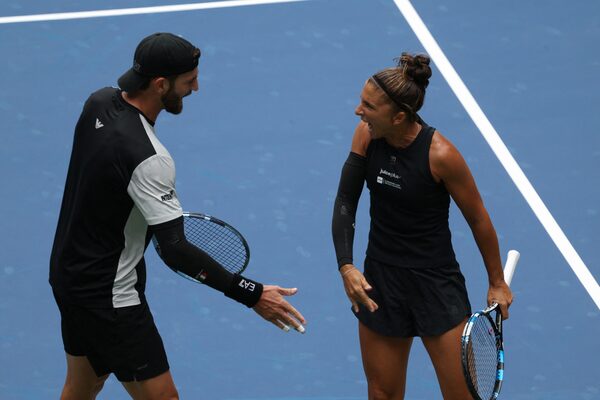 Sara Errani and Andrea Vavassori react during their quarter final mixed doubles match against Russia's Andrey Rublev and Czech Republic's Karolina Muchova at the U.S. Open on Tuesday in New York.Kylie Cooper/Reuters