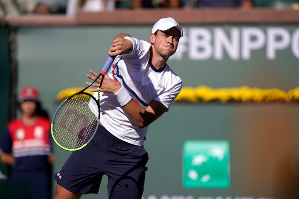 Vasek Pospisil serves to Denis Shapovalov at the BNP Paribas Open tennis tournament Saturday, Oct. 9, 2021, in Indian Wells, Calif.Mark J. Terrill/The Associated Press