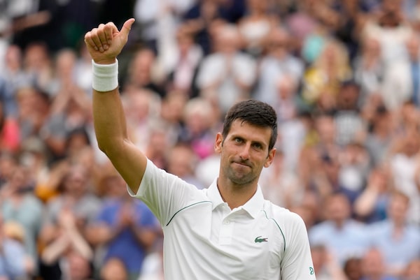 Novak Djokovic celebrates after beating Kwon Soonwoo in a men's first-round singles match at Wimbledon, in London, on June 27.Kirsty Wigglesworth/The Associated Press