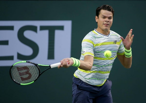Milos Raonic returns a forehand to Felix Auger Aliassime during the BNP Paribas Open on March 11, 2018 at the Indian Wells Tennis Garden in Indian Wells, Calif.Jeff Gross