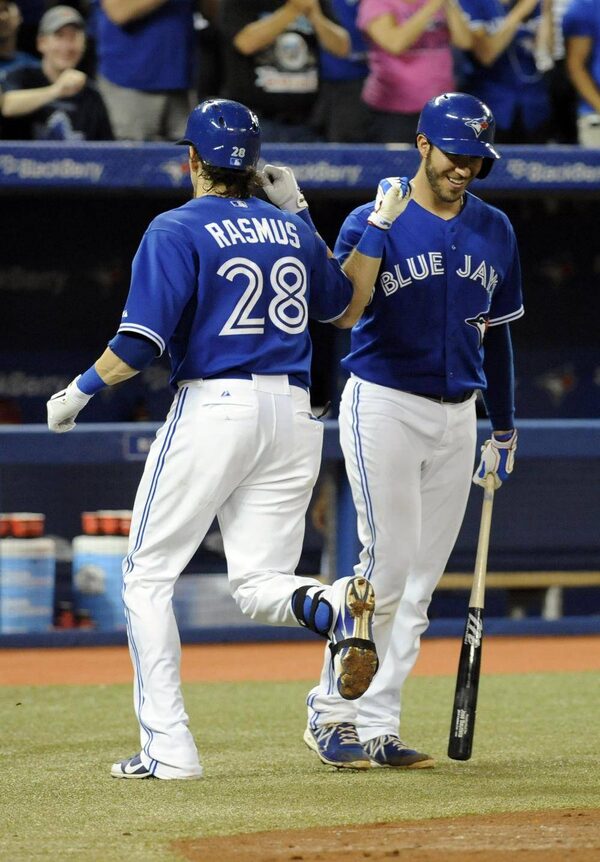 Toronto Blue Jays Colby Rasmus (L) is greeted at home by teammate J.P Arencibia after hitting a two-run home run against the Minnesota Twins in the fourth inning of their MLB American League baseball game in Toronto July 7, 2013.JON BLACKER/Reuters