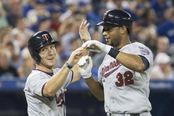 Minnesota Twins Aaron Hicks (right) is congratulated by Clete Thomas after hitting a two run homer off Toronto Blue Jays pitcher Todd Redmond during fifth inning AL baseball action in Toronto on Sunday July 7, 2013.CHRIS YOUNG/The Canadian Press