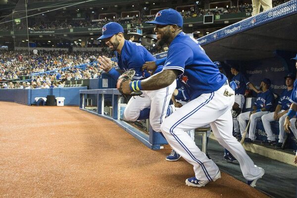Toronto Blue Jays Jose Bautista (left) and Jose Reyes race out of the dugout before the start of their game against Minnesota Twins in AL baseball action in Toronto on Sunday July 7, 2013.Chris Young/The Canadian Press