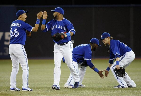 Toronto Blue Jays (L-R) Munenori Kawasaki, Emilio Bonifacio, Jose Reyes and Coby Rasmus celebrate their victory over the Minnesota Twins in their MLB American League baseball game in Toronto July 7, 2013.JON BLACKER/Reuters