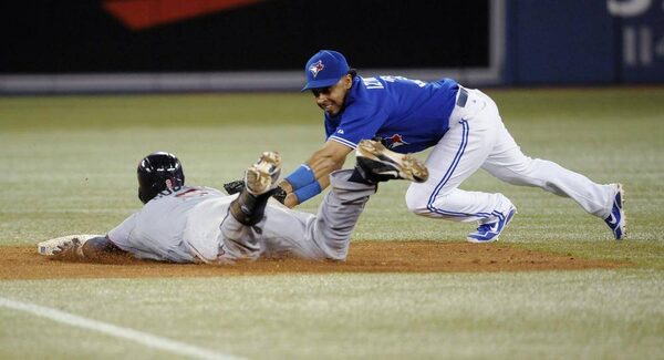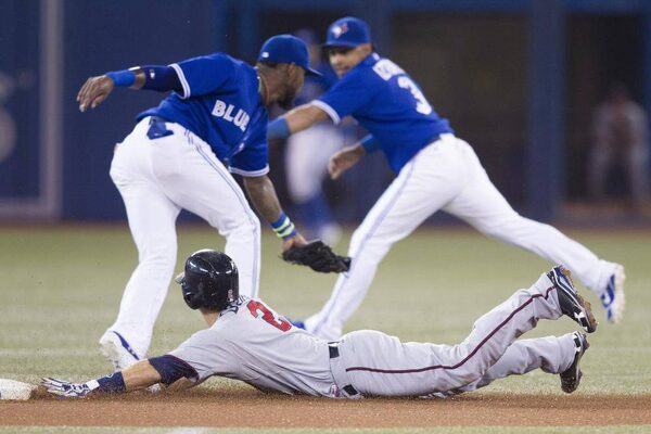 Minnesota Twins Brian Dozier safely slides into second base as Toronto Blue Jays Jose Reyes (left) and Maicer Izturis fail to take an errant throw from Jays catcher J.P. Arencibia during first inning AL baseball action in Toronto on Sunday July 7, 2013. THE CANADIAN PRESS/Chris YoungCHRIS YOUNG/The Canadian Press
