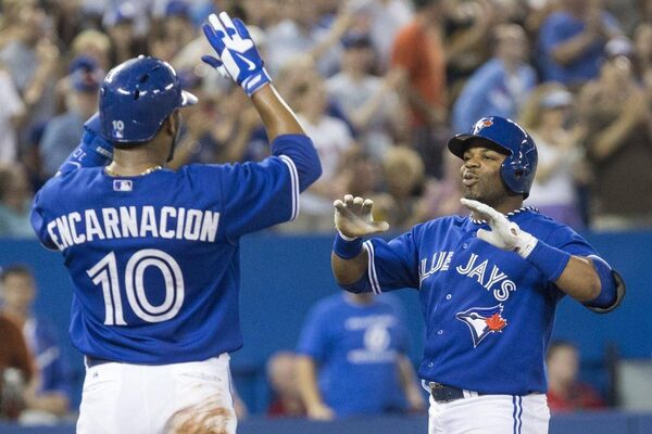 Toronto Blue Jays Rajai Davis (right) celebrates with Edwin Encarnacion after hitting a three run homer off Minnesota Twins pitcher Scott Diamond during fifth inning AL baseball action in Toronto on Sunday July 7, 2013.CHRIS YOUNG/The Canadian Press