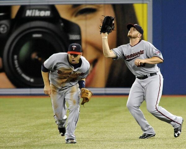 Minnesota Twins' Chris Parmelee (R) catches Toronto Blue Jays' Edwin Encarnacion's pop fly over teammate Brian Dozier to end the third inning of their MLB American League baseball game in Toronto July 7, 2013.JON BLACKER/Reuters