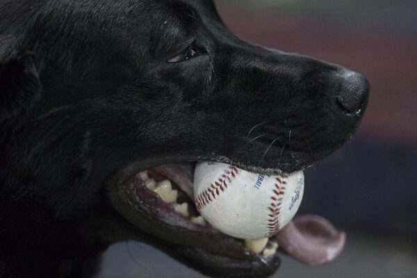Police sniffer dog Ace holds a baseball in its mouth as Toronto Blue Jays take on Minnesota Twins in AL baseball action in Toronto on Sunday July 7, 2013.CHRIS YOUNG/The Canadian Press