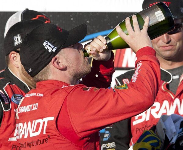Justin Allgaier celebrates after winning the NAPA Auto Parts 200 NASCAR Nationwide race at the Circuit Gilles Villeneuve in Montreal on Saturday, August 18, 2012.Ryan Remiorz/The Canadian Press