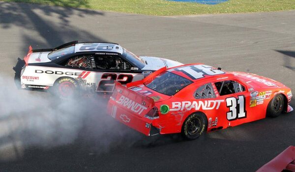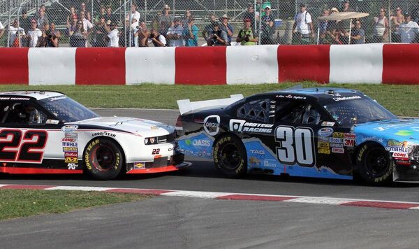 Jacques Villeneuve (22) runs into Alex Tagliani (30) at the NAPA Auto Parts 200 NASCAR Nationwide race at the Circuit Gilles Villeneuve in Montreal on Saturday, August 18, 2012.Tyler Remiorz/The Canadian Press