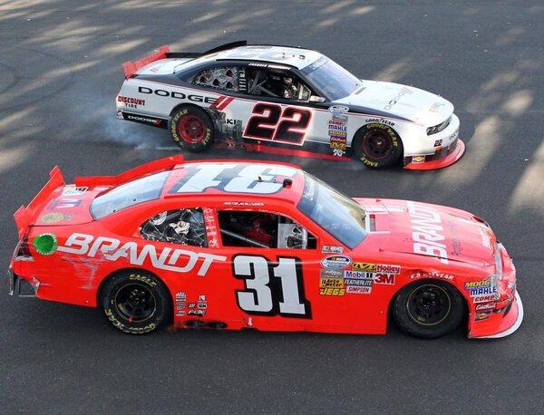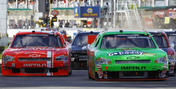 Driver Justin Allgaier (L) races against Danica Patricks (R) during NAPA Auto Parts 200 Nationwide Series NASCAR race in Montreal, August 18, 2012.OLIVIER JEAN/Reuters
