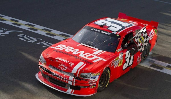 Driver Justin Allgaier celebrates after winning NAPA Auto Parts 200 Nationwide Series NASCAR race in Montreal, August 18, 2012.OLIVIER JEAN/Reuters