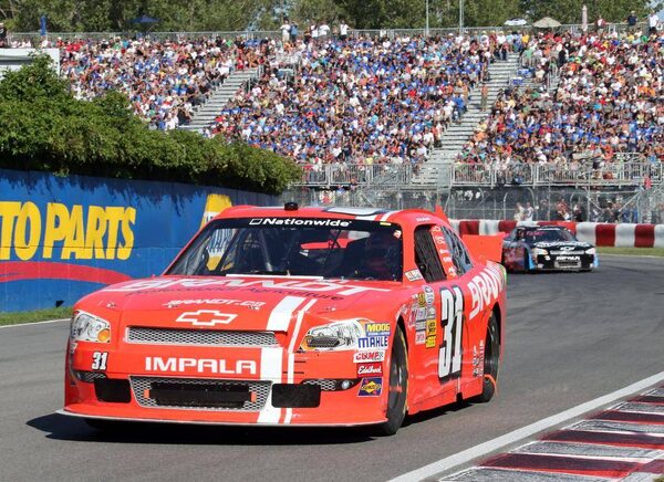 Justin Allgaier drives through the Senna corner on his way to winning the NAPA Auto Parts 200 NASCAR Nationwide race at the Circuit Gilles Villeneuve in Montreal on Saturday, August 18, 2012.Tom Boland/The Canadian Press
