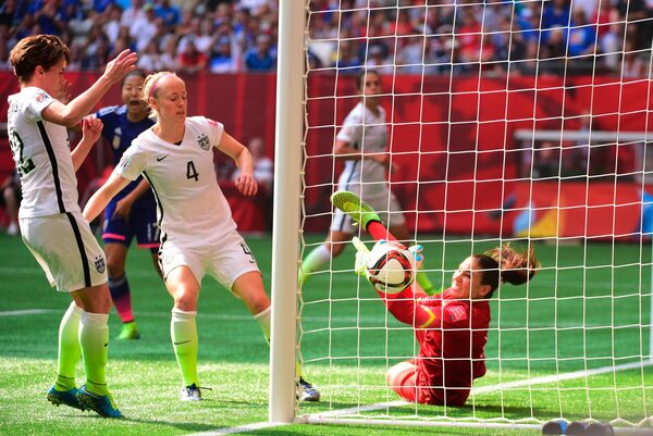 United States defender Meghan Klingenberg (22) and defender Becky Sauerbrunn (4) watch as goalkeeper Hope Solo (1) tries to stop an own goal by United States defender Julie Johnston.Anne-Marie Sorvin