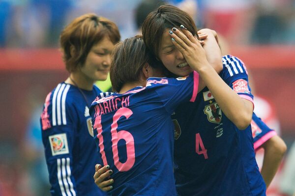 Japan's Mana Iwabuchi (16) and Saki Kumagai (4) console each other after their loss to the United States in the FIFA Women's World Cup soccer final in Vancouver.Jonathan Hayward/The Canadian Press