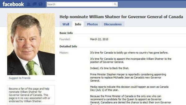 "It's time for Canada to boldly go where no country has gone before." That phrase leads off a Facebook page calling for Canadian-born actor William Shatner to be named Canada's next Governor General.The Canadian Press