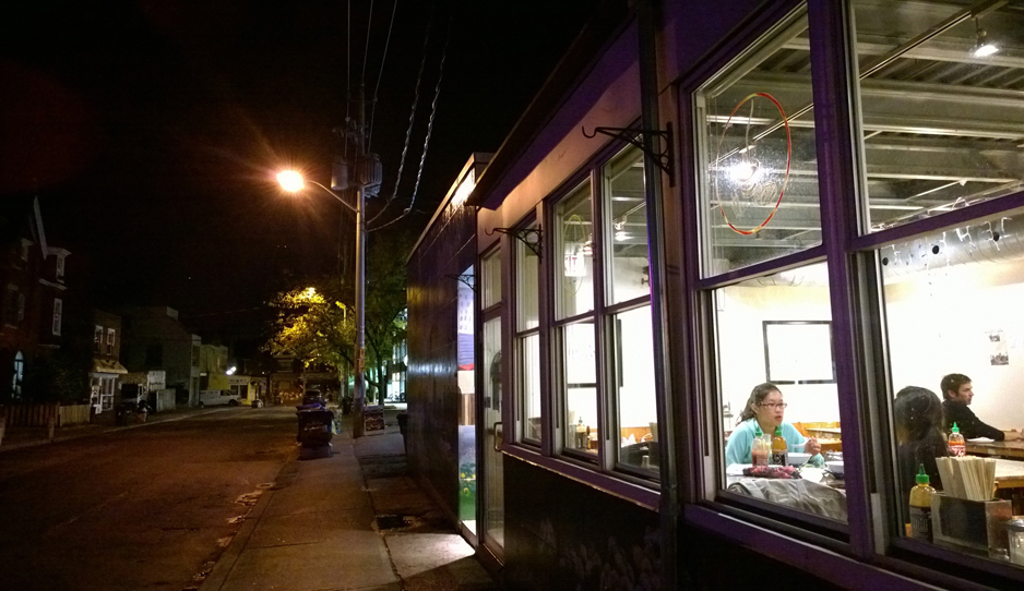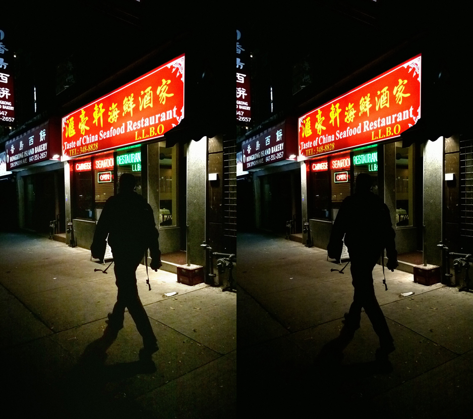 Taken on Spadina Ave. near Dundas St., the right side of this comparison photo on the right was shot at 3200 ISO, with exposure compensation of +.3 to balance the bright restaurant sign. On the left I used some selective dodging around the walking figure to see how image quality holds up when the shadows are brightened.