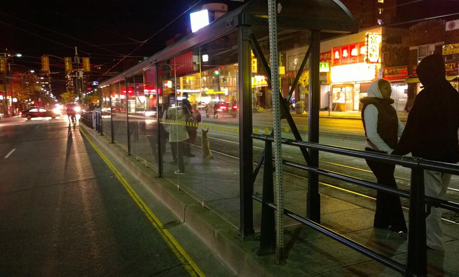 Chinatown at night is always a colourful place, more so after rain has fallen. This was a good test to see how the camera handled mixed street lighting and harsh lighting at the Spadina streetcar stop at Dundas St. This photo came straight out of the camera with no levels adjustments, 800 ISO.