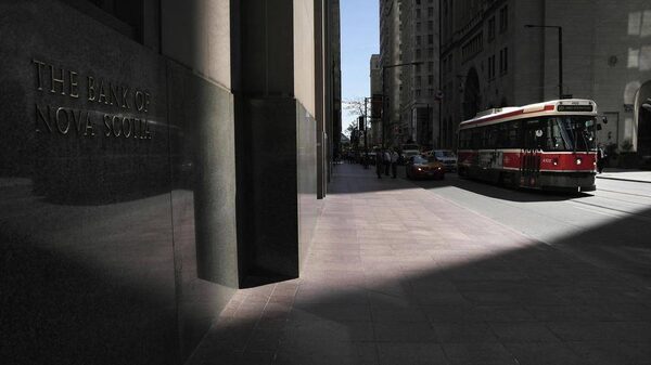 The NX20's 20.3 Mega-pixel sensor handles both highlights and shadows very well. Toronto 504 streetcar with wide sweep of sidewalk pavement in foreground. The Bank of Nova Scotia on King Street with logo on left on side of building.Moe Doiron/The Globe and Mail