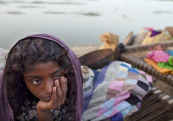 A flood victim sits on her bed along a road where many families are living after being forced to flee the flood waters August 24, 2010 in Shadadkot , Pakistan.Paula Bronstein
