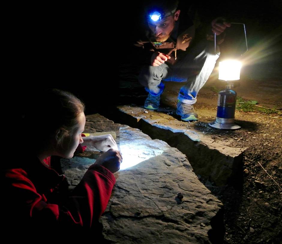 “Late Cretaceous footprints,” Ms. Buckley says, pointing to a stunning, three-toed dinosaur print that suddenly comes into focus. “They don’t show up well during the day, but at night, with a lantern on, the detail pops out.”