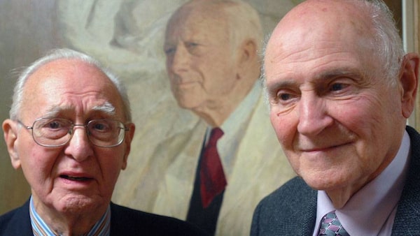 William Feindel, left, is reunited with former patient Murray Graham in Montreal. (The portrait in the background is of Wilder Penfield, the institute's founder.)