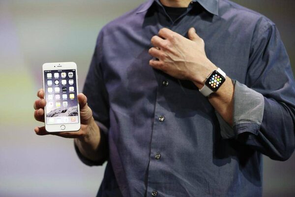 Apple CEO Tim Cook wears the Apple Watch and shows the iPhone 6 Plus during an Apple event at the Flint Center in Cupertino, California, September 9, 2014.© Stephen Lam / Reuters/Reuters